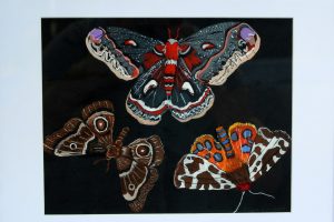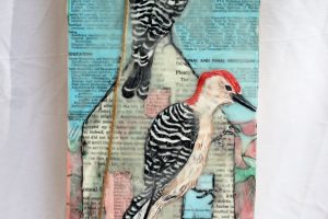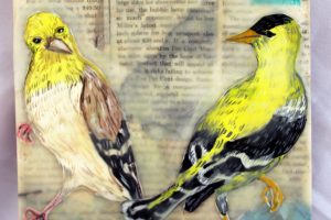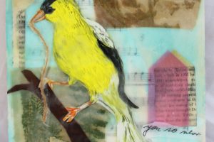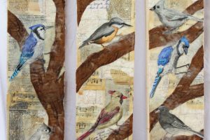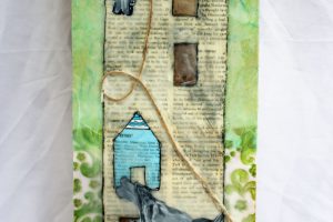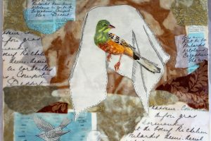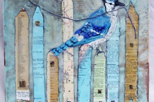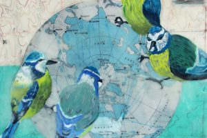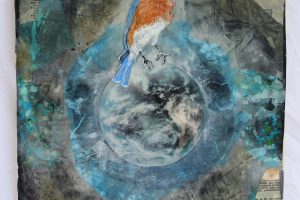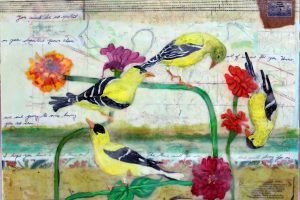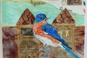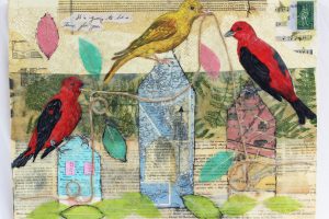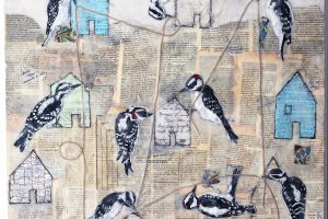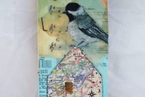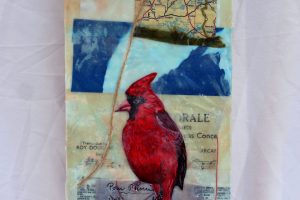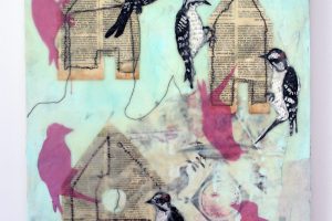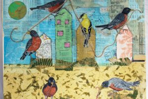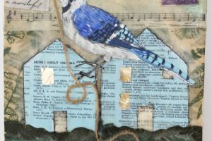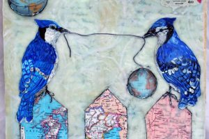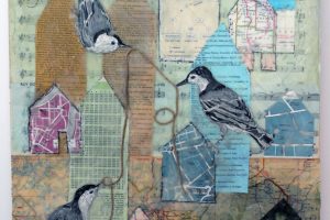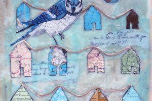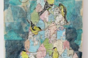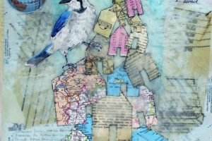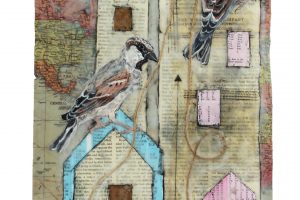 “My encaustic collage work incorporates old letters, maps, wallpaper, magazines and books. I often include snippets of letters, mostly from family who are no longer with us and delight in bringing back their handwriting, voice and memory into a new space with the vibrant, present birds, a constant reminder that the past is always with us. I was cheered by rereading old letters from my grandparents and reminded myself of the challenging times in history they had lived through. Often I found a line or a phrase in an old letter that resonated with me. ‘It’s Going to be a Time for You,’ a line from a letter written by my godfather, seemed especially relevant in the midst of last spring’s isolation and uncertainty. Unable to sleep and without a normal teaching schedule, I found myself staying up later and later, each night creating paintings featuring images of the globe from my childhood encyclopedias and constantly cutting out the shapes of houses. Our self-imposed isolation left me feeling stranded on my own island, with the occasional communication with others doing the same thing through a screen or a distant, masked hello to neighbors walking up the street. I began incorporating pieces of string connecting the houses, separate yet bound by this shared global experience. The birds, embodying nature’s strength and impartial disposition, grew bigger and more threatening, yet their presence was still a reminder that the natural world would continue to remain largely unchanged and that life might one day feel as it had before the pandemic.”