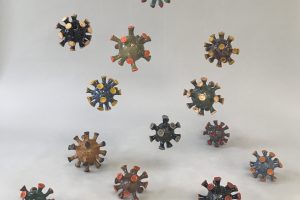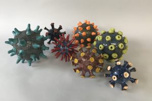 When the coronavirus outbreak forced Morazzi Henderson’s ArtSpace studio to close, she started working from home. To cope with her fear, uncertainty and understanding of the world around her and within, she started making forms that looked like the covid virus. Sculptures of different sizes, shapes and colors soon emerged. Creating these visual representations of the virus became a way of making the abstract tangible.