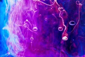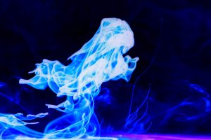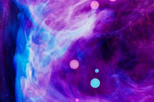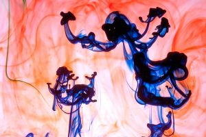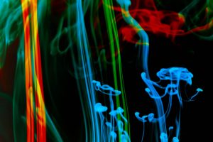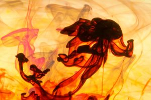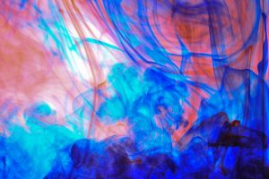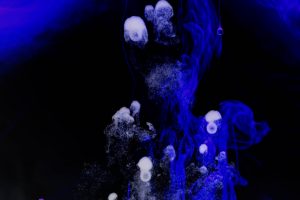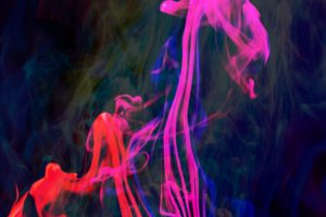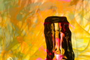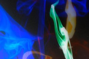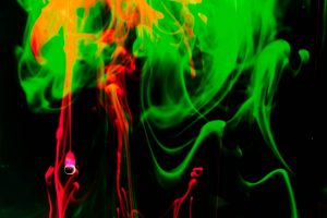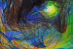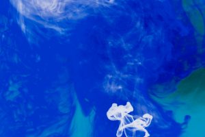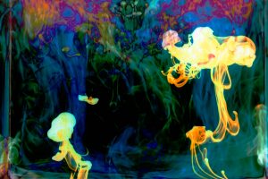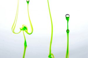 “Interesting things happen when fluids mix together. Watch when milk is added to coffee, fresh water mixes with silt-laden glacier melt, or when a drop of food coloring is added to water. The latter was explored in a previous show called Aqueous Abstracts. In this sequel the vocabulary was expanded by adding mineral oil, Karo syrup, and food coloring, in addition to a few new tricks on how the fluids were introduced. The prints are all on aluminum, enhancing the colors.”