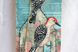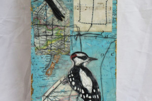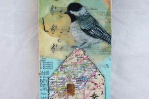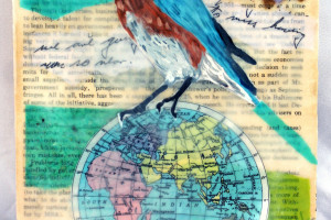 “My encaustic collage work incorporates old letters, maps, wallpaper, magazines and books. I often include snippets of letters, mostly from family who are no longer with us and delight in bringing back their handwriting, voice and memory into a new space with the vibrant, present birds, a constant reminder that the past is always with us. I was cheered by rereading old letters from my grandparents and reminded myself of the challenging times in history they had lived through. Often I found a line or a phrase in an old letter that resonated with me. ‘It’s Going to be a Time for You,’ a line from a letter written by my godfather, seemed especially relevant in the midst of last spring’s isolation and uncertainty. Unable to sleep and without a normal teaching schedule, I found myself staying up later and later, each night creating paintings featuring images of the globe from my childhood encyclopedias and constantly cutting out the shapes of houses. Our self-imposed isolation left me feeling stranded on my own island, with the occasional communication with others doing the same thing through a screen or a distant, masked hello to neighbors walking up the street. I began incorporating pieces of string connecting the houses, separate yet bound by this shared global experience. The birds, embodying nature’s strength and impartial disposition, grew bigger and more threatening, yet their presence was still a reminder that the natural world would continue to remain largely unchanged and that life might one day feel as it had before the pandemic.”